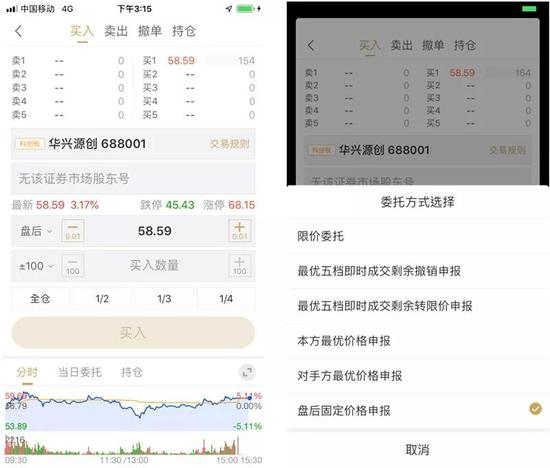 科创板新增盘后固定价格申报委托方式,券商APP在行情界面以及交易界面,都做出了相应的变化。