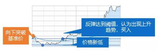 投资者可以使用反弹买入策略,设定基准价和反弹幅度。当股价下跌至基准价时,系统会持续监控最低价和反弹幅度,只有当证券上涨到预设反弹幅度时,才“下手”买入。