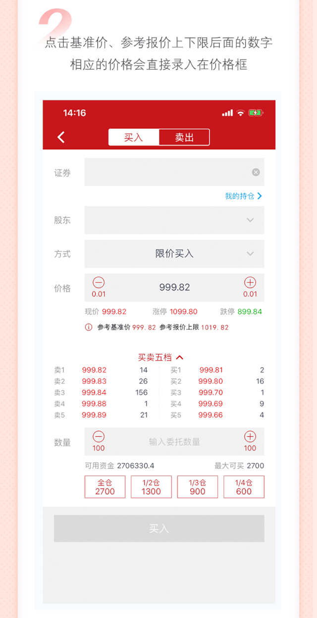 中信证券信e投APP也可以自动计算价格笼子的上下限。当客户委托下单时,可以在五档报价区清晰地看到,也间接提升下单的速度,是不是很贴心?
