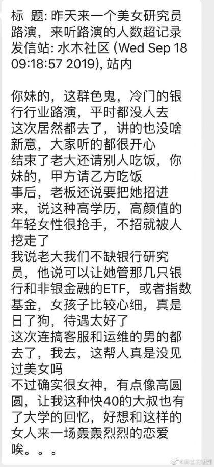 一个女研究员,颜值高有错么,当然没有错。但是,此贴一发,哪家基金还敢请她去做基金经理,帖子里都说了,这群色鬼。