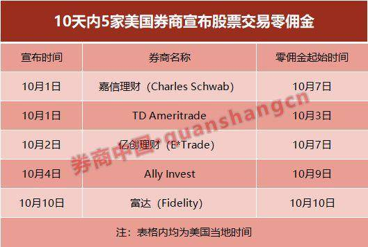 不过,当10月1日,美国最大在线券商嘉信理财宣布将股票、ETF和期权的在线交易佣金从4.95美元降至0美元时,整个金融行业还是有点措手不及。随后,TD Ameritrade、E*Trade以及未上市的 Ally Invest 等美国经纪商纷纷跟进,将交易佣金降为零。