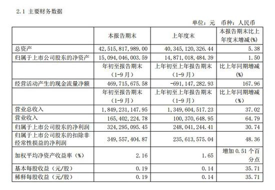 2019年前三季度报告,实现营业总收入18.49亿元,同比增长37.02%;归属于上市公司股东的净利润3.24亿元,同比增长30.74%;归属于上市公司股东的扣除非经常性损益的净利润3.50亿元,同比增长48.36%。