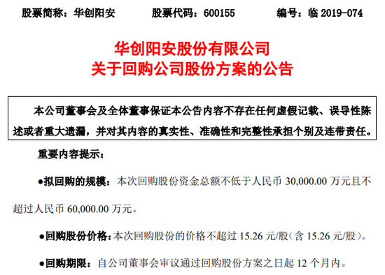 在成功完成首期员工计划仅半月后,上个月初,10月9日晚间,华创阳安再次推出回购公司股份方案。