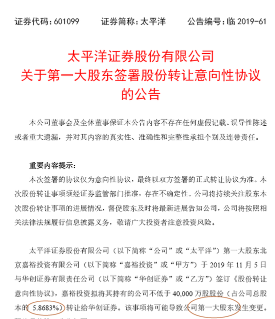 华创阳安(600155.SH)也同时公告,华创证券有限责任公司(以下简称“华创证券”)于2019年11月5日与北京嘉裕投资有限公司(以下简称“北京嘉裕”)签署《股份转让意向性协议》,拟收购其持有的太平洋证券股份有限公司股份不低于4亿股(占目标公司总股本的5.8683%)。