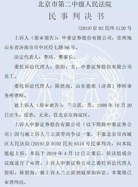 一审法院判决,中泰证券支付兰某2017年1月1日至2017年12月31日期间暂扣的奖金10.25万元!