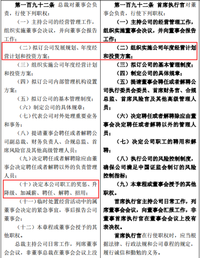 《章程》规定首席执行官不再拟订公司发展规划;不再拟订公司内部管理机构设置方案;不再代表公司对外处理重要业务和事务;此前由总裁负责的拟订公司经营计划及投资、融资、资产处置方案,制定和批准职工薪酬方案和奖惩方案等工作以后将由执行委员会执行。