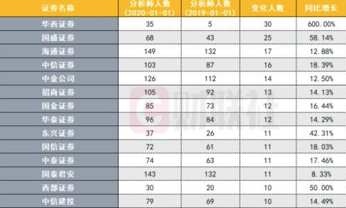 从变化人数来看,增长超10人的有华西证券、国盛证券、海通证券、中信证券、中金公司、招商证券等14家。