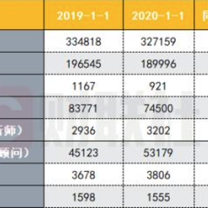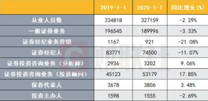 据财联社统计choice及中证协数据发现,2019年全国121家券商的证券持证上岗从业人数由33.48万降至32.72万人。其中,证券经纪人、一般证券业务、证券经纪营销和投资主办人注册人数减少;而投顾人员、分析师和保荐代表人注册人数逆势增加。