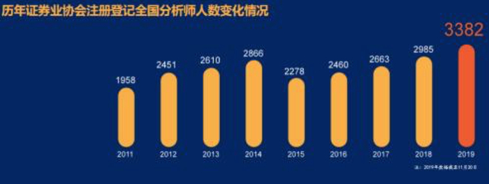 2015-2019年,证券业协会注册登记全国分析师人数分别为2278、2460、2663、2985和3382。截至2020年1月1日,该数据为3202,同比增长9.06%。