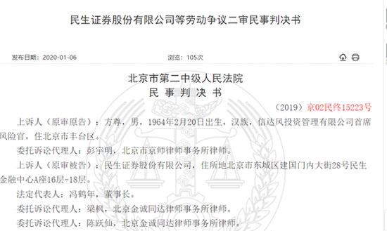 2018年6月8日,方尊以民生证券拖欠工资为由申请离职。在辞职一个月之后,也就是2018年7月11日,方尊向北京市东城区劳动人事争议仲裁委员会提起仲裁。