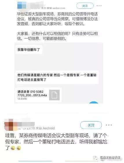 简单来说,华创证券邀请投资人参与的关于上市公司星期六旗下遥望网络的交流会上,华创通过三方专家网络邀请的遥望网络的“陈总”做了一场分享,在QA环节被遥望网络董秘拨入并当场指出:公司中层以上没有姓陈的,而且华创是第二次请“假专家”。场面一度极为尴尬。而令我意外的是,这个电话会没有立刻结束,而是留着让这位董秘在电话上一顿痛骂了,并以“等着收律师函”结束对话。