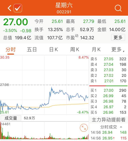 相较于上证指数以1.84%涨幅收红,星期六(002291.SZ)20日的股价以25.61元大幅低开,较前日收盘价跌幅为8.47%,最终收盘于27元,跌幅为3.5%。