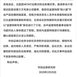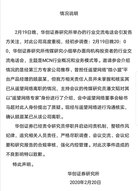 2月20日,华创证券就此事独家回应了财联社记者的提问。华创证券在声明中表示,2月19日晚20:00,华创证券研究所传媒研究小组举办面向机构投资者的行业交流电话会,主题是MCN行业概况和业务模式等。邀请参会介绍情况的是经第三方专家公司推荐、曾担任遥望网络“微小盟”平台产品经理的顾晨某,但我方相关责任人员并未掌握和核实其已从遥望网络离职的情况,主持会议的传媒研究员潘文韬对其以“遥望网络专家”身份进行了介绍,会中遥望网络董事会秘书马超对此人身份提出了质疑。现经与遥望网络进行沟通核实,确认顾晨某已从该公司离职。
