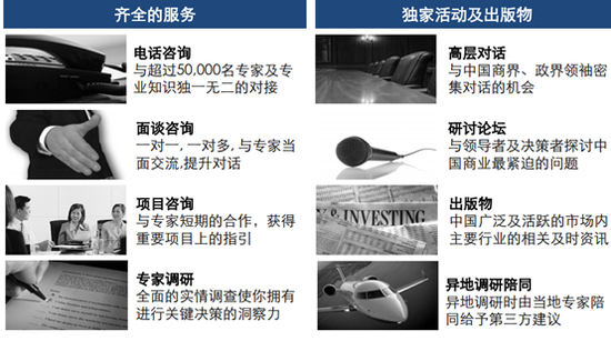 在一份专家库公司提供服务的列表中,共有电话咨询、面谈咨询、项目咨询、专家调研、高层对话、研讨论坛、出版物和异地调研陪同等8大类服务。其中电话咨询的服务说明中提到,可与超过5万名专家及专业知识独一无二的对接。
