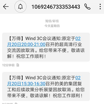 值得一提的是,Wind 3C会议今日上午发出通知,原定于2月20日15:30召开的美的集团复工和后续政策分析展望会议、20:00召开的超高清行业交流会议因故取消。