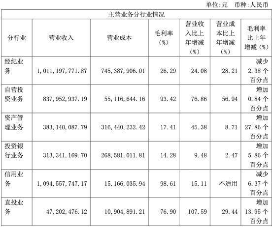 报告期内,浙商证券经纪业务实现营业收入10.11亿元,同比增长24.08%,毛利率26.29%,比上年减少2.38个百分点;自营投资业务实现营业收入8.38亿元,同比增长76.86%,毛利率93.42%,比上年增加0.84个百分点;资产管理业务实现营业收入3.83亿元,同比增长45.38%,毛利率17.41%,比上年增加27.86个百分点;投资银行业务实现营业收入3.13亿元,同比增长9.48%,毛利率14.28%,比上年增加5.86个百分点;信用业务实现营业收入10.95亿元,同比增加15.11%,毛利率98.61%,比上年减少6.37个百分点;直投业务实现营业收入0.47亿元,同比增加107.59%,毛利率76.90%,比上年增加13.95个百分点;期货业务实现营业收入27.24亿元,同比增加85.19%,毛利率6.60%,比上年减少5.34个百分点。