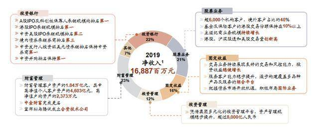 透视中金公司年报信息,其“双基六柱”的提法成为2019年的新亮点:“双基”是指研究和信息技术,“六柱”则是指投资银行、股票业务、固定收益、私募股权、资产管理、财富管理六大板块。