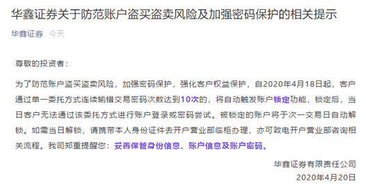4月20日,华鑫证券通过官方微信号发出提示,公司账号将从4月18日起,客户通过单一委托方式连续输错密码10次,将自动锁定账户;隔日可自动解锁,如需当日解锁可至营业部临柜办理。