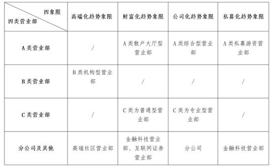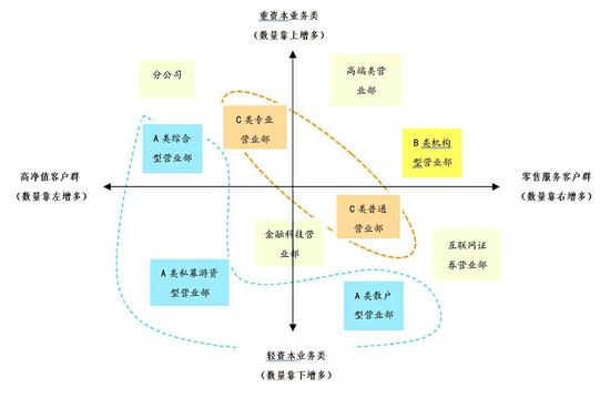 @券商小哥哥 根据监管对分支机构的ABC分类以及分公司模式,以客户与业务为横竖轴,将券业分支机构分为四个象限。