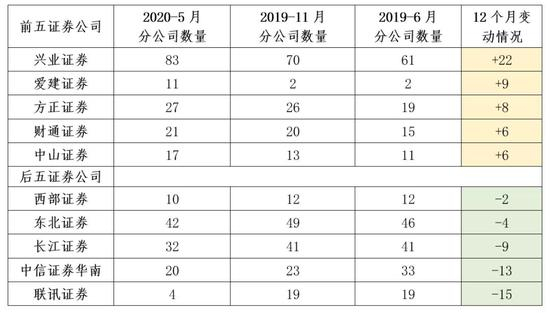粤开证券(原联讯证券)最近半年撤销了15家分公司:在2019年11月,分公司数量为19家,2020年5月减至4家;被中信证券并购后,中信华南(原广州证券)减少13家分公司;长江证券最近半年也减少了9家。