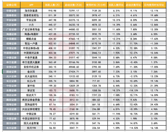 在启动次数和使用时长方面,上述26家券商基本为正增长。