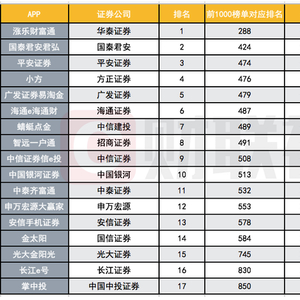 下表为《2020年6月份移动APPTOP1000榜单》中券商APP排名: