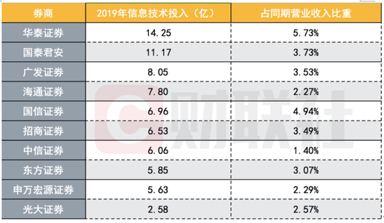 财联社记者梳理已发布券商年报数据发现,2019年信息技术投入居前的10家上市券商,年内投入金额均超过2亿元,占当期营业收入比重在2%以上。华泰证券2019年信息技术投入高达14.25亿元位居第一,占营业收入比重达5.73%。国泰君安的研发投入也超过10亿,远高于其他券商,头部券商研发投入普遍高于5亿,而行业尾部券商在IT方面投资额很小,尚有超50%的券商信息投入金额低于1亿,只能维护基本交易功能。