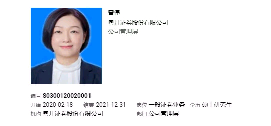 曾伟女士,1968年出生,硕士研究生学历,曾任中华企业股份制咨询公司咨询顾问,对外经济贸易大学管理学院会计系教师,美国史丹利公司北京办事处财务经理,北京森德散热器有限公司副总经理(分管财务),北京ABB低压电器有限公司财务部经理,荷兰泰潘集团财务经理;2013年4月至2020年3月任广州开发区金控财务资金部总经理。2020年3月至今担任粤开证券副总裁兼财务总监。