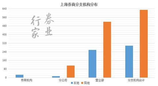 从券商分支机构属地来看,上海本地券商分公司13家,营业部258家,外地券商分公司111家,营业部520家。