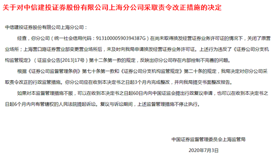 为此,上海证监局对中信建投上海分公司采取责令改正的监管措施,要求其在收到本决定书之日起3个月内完成整改,并提交书面整改报告。