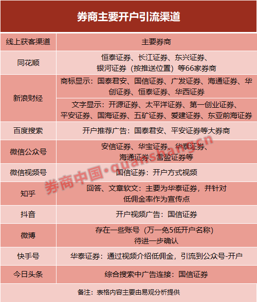 近几年来,随着互联网社交工具的发展,券商能够采用的线上获客渠道也趋于多样化。易观分析金融行业分析师田杰向券商中国记者表示,当前券商主要的线上获客渠道包括同花顺、新浪财经、百度搜索、微信公众号、视频号、知乎、抖音、微博、快手号、今日头条等。其中有66家大中小券商进驻同花顺平台,国泰君安、国信证券等约15家券商进驻新浪财经。据其分析,大券商资金充足可以重金购买百度、新浪财经、抖音等昂贵广告位,小券商通过与知乎、微信公众号等博主合作,通过其引流开户。