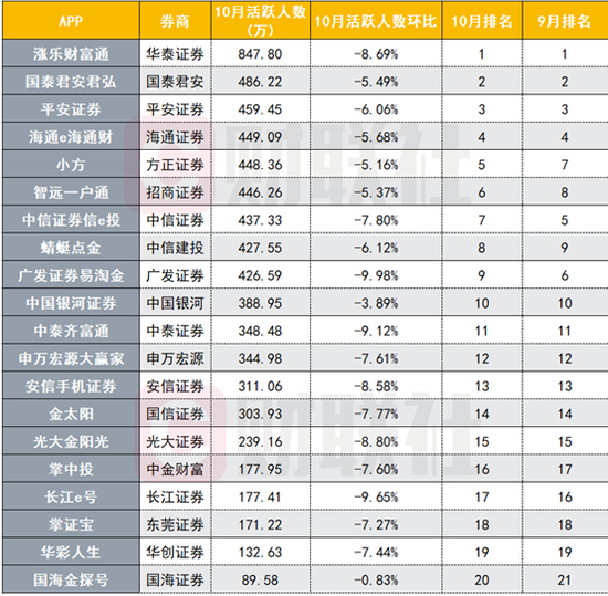 券商APP月活连续3个月滑坡,10月前20较7月高点平均降17%,涨乐财富通、国君君弘、平安证券连续前三