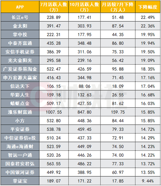 券商APP月活连续3个月滑坡 10月前20较7月高点平均降17%