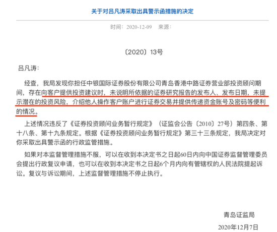 青岛证监局认为,吕凡涛任职中银证券青岛香港中路证券营业部投资顾问期间,存在向客户提供投资建议时,未说明所依据的证券研究报告的发布人、发布日期,未提示潜在的投资风险,介绍他人操作客户账户进行证券交易并提供传递资金账号及密码等便利的情况。