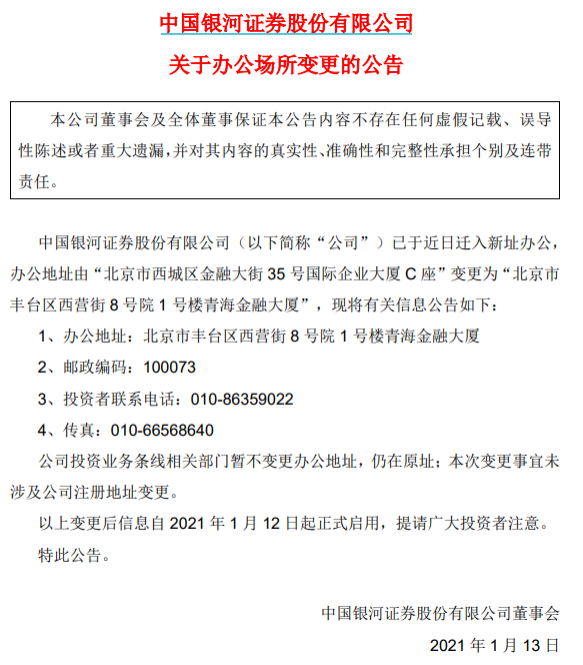 在办公地址变更之际,相应邮政编码、投资者联系电话、传真等与地址绑定的信息也同时变更。不过,银河证券此次变更未涉及注册地址变更。银河证券表示,变更后信息自2021年1月12日起正式启用,提请广大投资者注意。