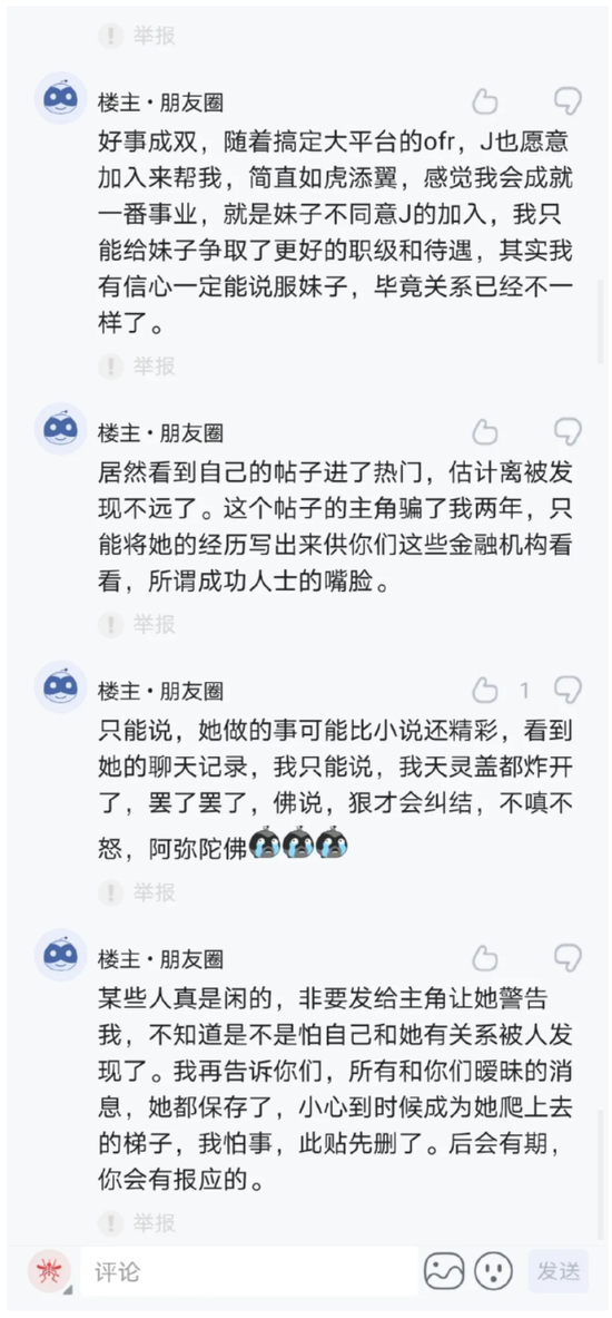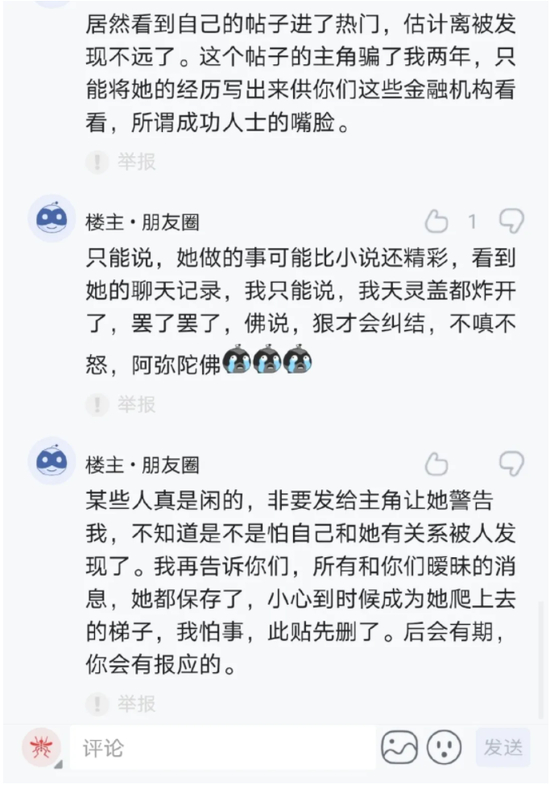 居然看到自己的帖子进了热门,估计离被发现不远了。这个帖子的主角骗了我两年,只能将她的经历写岀来供你们这些金融机构看看,所谓成功人士的嘴脸。