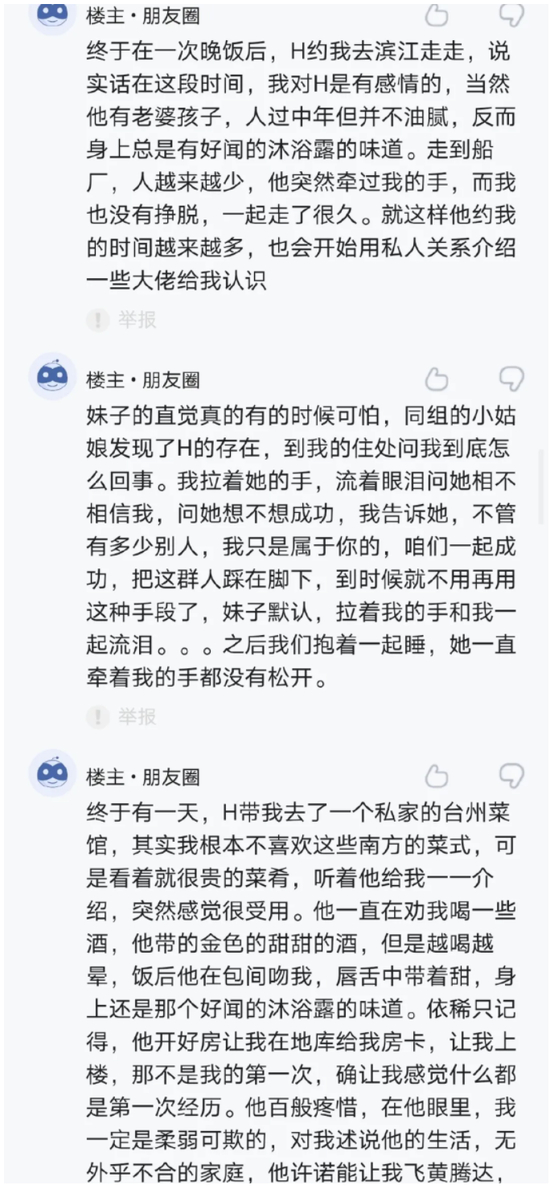 终于在一次晚饭后,H约我去滨江走走,说实话在这段时间,我对H是有感情的,当然他有老婆孩子,人过中年但并不油腻,反而身上总是有好闻的沐浴露的味道。走到船F,人越来越少,他突然牵过我的手,而我也没有挣脱,一起走了很久。就这样他约我的时间越来越多,也会开始用私人关系介绍一些大佬给我认识。