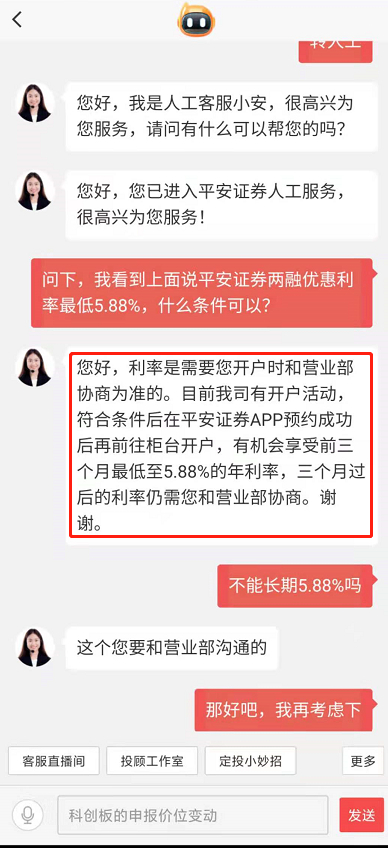 平安证券APP人工客服客服称,“目前我司有开户活动,符合条件后在平安证券APP预约成功后再前往柜台开户,有机会享受前三个月最低至5.88%利率,三个月过后的利率仍需和营业部协商”。