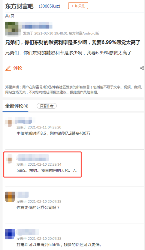 另据投资者透露,东方财富两融利率为6.2%,佣金是万分之1.2。此外,有投资者在东方财富股吧跟帖称其东财两融利率低至5.5%。