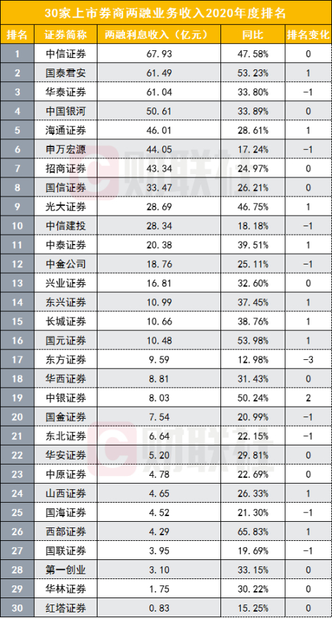 30家上市券商两融收入榜出炉:价格战火不断 融资利率跌破6%