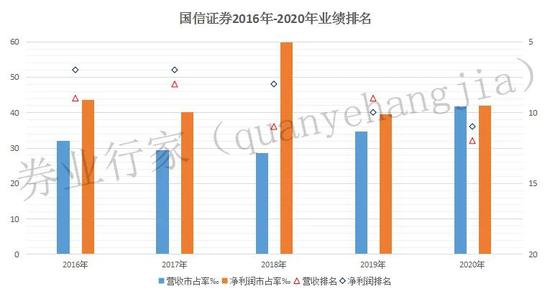 2016年-2019年,协会按合并口径统计,国信证券的营业收入分列第9、8、11、9位,净利润分列第7、7、8、10位。