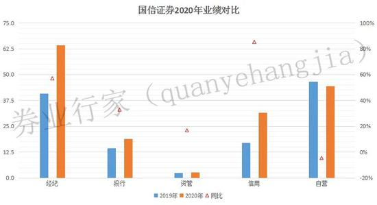 据国信证券年报,2020年营收和净利润的增幅分别为33.29%和34.73%。主要业务中,信用业务同比飙升85.20%,经纪业务同比增长56.99%,投行业务的同比增幅为32.71%;资管业务同比增幅为16.73%,而自营业务出现下降,降幅为4.70%。