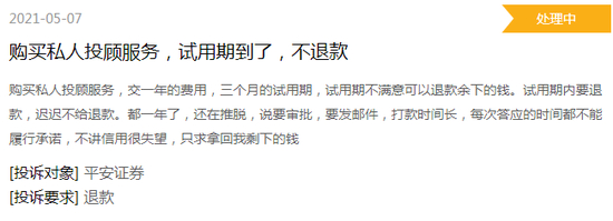 5月7日,“云端的草”在黑猫投诉发帖称,购买平安证券私人投顾服务,约定交一年的费用,三个月的试用期不满意,余额可退。但这位客户试用期内申请退款,历时一年仍没有拿回银子。