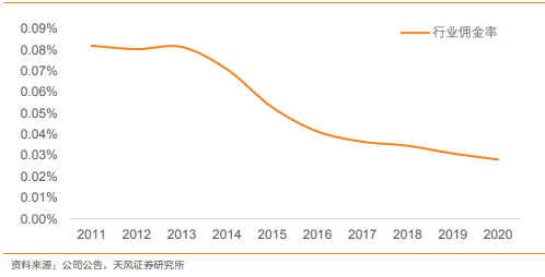 来自天风证券研报的数据显示,截至 2020 年底,经纪业务的净佣金率较 2019年下降9.20%,为万分之 2.81。
