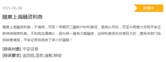 6月8日,用户“1808065891”通过黑猫投诉发帖,称平安证券在未与其沟通确认的情况下,“随意上调融资利息,不透明”。