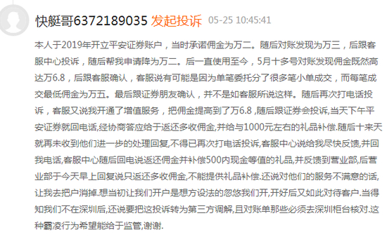 据前述发布于5月25日的投诉帖显示,该用户在2019年在平安证券开户,彼时承诺佣金为万分之二,但随后对账发现为万三。在其向客服中心投诉后,佣金降回万二。