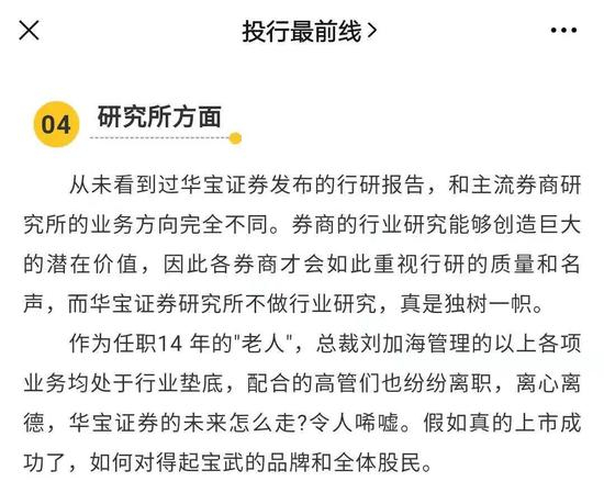 原文提到,华宝证券缺乏行业研究报告,“和主流券商研究所的业务方向完全不同”。