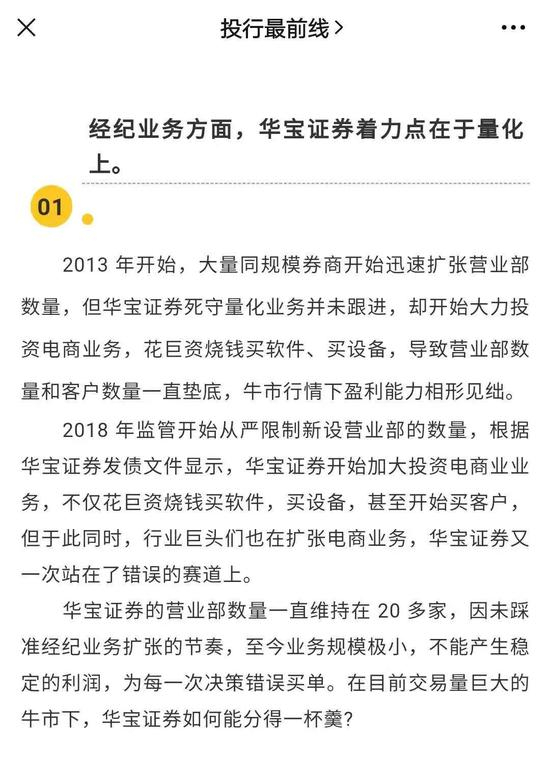 在经纪业务方面,原文称华宝证券“大力投资电商业务,花巨资烧钱买软件、买设备”,“站在了错误的赛道上”。