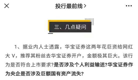 其一是质疑华宝证券“花巨资给网红大V,推荐其粉丝开户,金额极其巨大”。