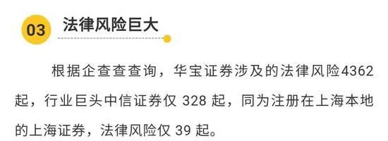 原文还以“法律风险巨大”为论据。提到华宝证券涉及的法律风险数量远超行业巨头中信证券,以及注册地同为上海本地的上海证券。
